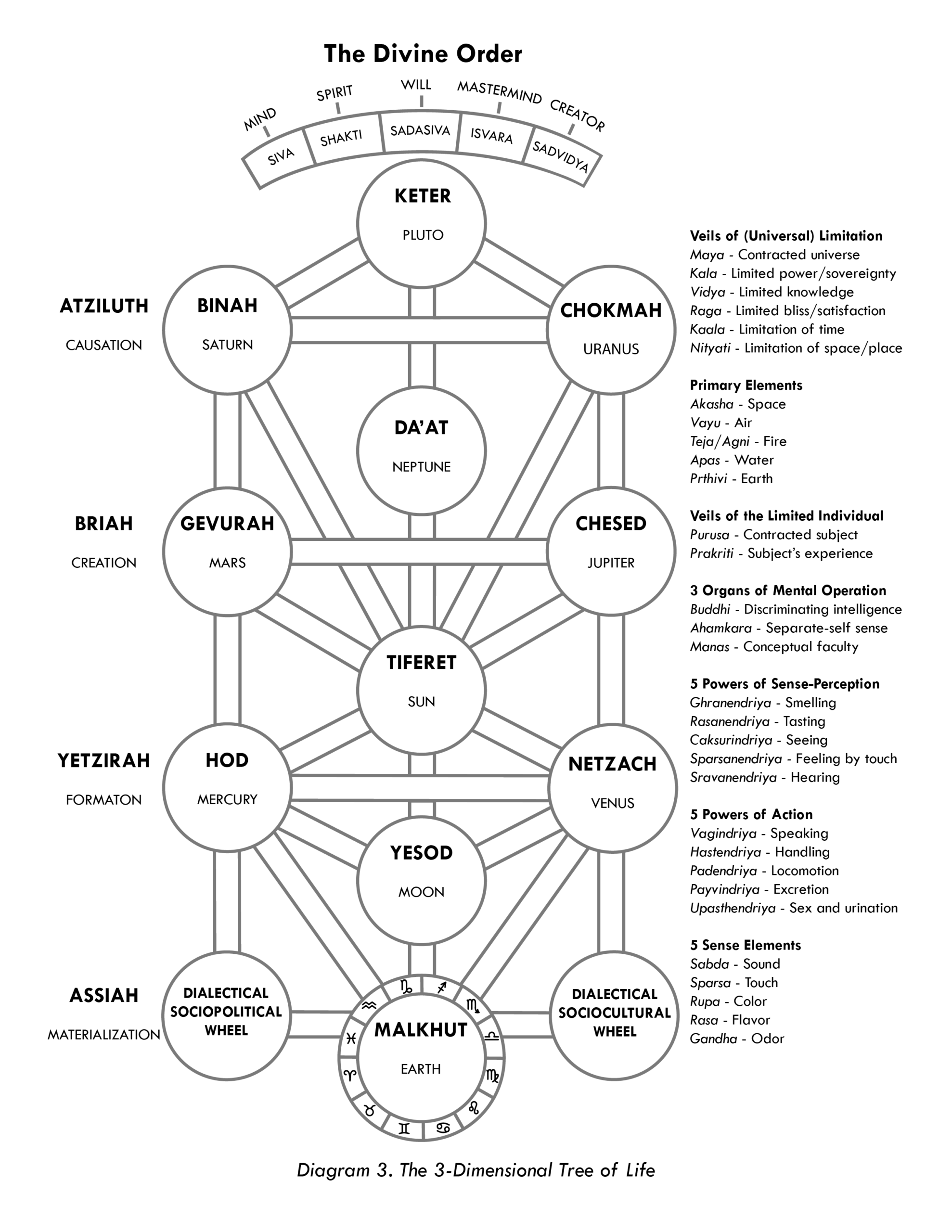 The second of the Four Worlds is Briah, the “World of Creation.” It is an analogue for Plato’s “World of Forms” and Kashmir Shaivism’s Isvara (Jnana, or Jnana-Shakti), the Omniscient One, who “Masterminds” the creative descent of Ain Sof Aur, or Siva-Shakti, into the third world, Yetzirah, the ether. Briah is the domain of “pure intellect,” meaning God, or Mind (prior to the emergence of space and time), “imagining,” and thus “creating,” the archetypal forms that will begin to “take shape” in the ether, the primordial space element. Because its “activity” is prior to creation, it is an emanated dimension.